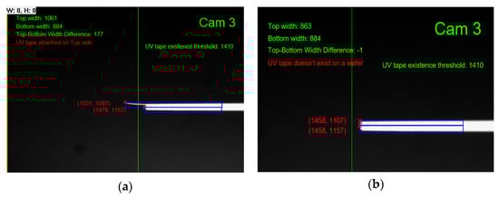Finally, Cam 3 captures the image of the wafer flank to detect the attached UV tape. UV tape can be detected by changing of image values to black and white (image-binarization) and with thickness and threshold comparison with the captured image, as shown in Figure 10a,b.