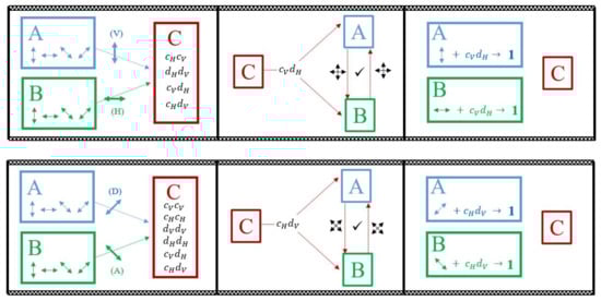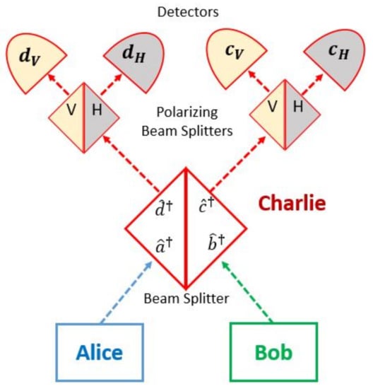 Since 1984, other protocols have been proposed to address security vulnerabilities in implementations of BB84 [4,5,6,7,8]. One such protocol is Measurement-Device-Independent QKD (MDI-QKD), depicted in Figure 1, which addresses the vulnerability of Bob’s measurement to malicious signals introduced on the quantum channel by Eve. MDI-QKD moves the act of photon measurement from Bob to an untrusted third party, Charlie (shown in red). Alice and Bob each send one polarization-encoded photon to Charlie, who subjects them to two-photon interference in a symmetric 50:50 beam splitter, followed by polarization-sensitive detection via a pair of polarizing beam splitters and four single-photon detectors, each corresponding to a polarization and beam splitter output port (, , , ). Charlie publicly announces which detectors registered photons. Subsequently, Alice and Bob publicly announced which polarization basis (horizontal-vertical or antidiagonal-diagonal) they used for encoding. From this information and their private knowledge of their own photon encodings, Alice and Bob can infer one bit of shared secret key in 25% of the exchanges under ideal circumstances. Figure 2 demonstrates these steps explicitly for two key attempts—one in the horizontal-vertical basis and one in the antidiagonal-diagonal basis. The blue and green arrows denote communication on a sensitive quantum channel, while red arrows denote communication on an open classical channel visible to Charlie. Similarly, Table 1 displays all possible same-basis input states, Charlie’s potential detection states for each input, and the shared bit value associated with a given input state. When Alice and Bob choose opposite encoding bases for a trial, that trial is discarded and no key is generated. The same-basis inputs and cannot be used to generate a key bit because Charlie can infer the bit from his measurement and knowledge of the encoding basis. There are also some detected states for antidiagonal-diagonal basis encodings that can occur for multiple input states, making them unusable for key generation.