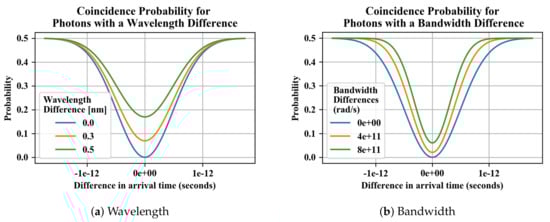Coincidence probability as a function of beam splitter arrival time difference for photon pairs with varying degrees of distinguishability. The coincidence rate vanishes for perfectly identical photons arriving simultaneously, with the width of the HOM dip determined by the pulse bandwidth. (a) displays the coincidence probability curves for two photons with an identical bandwidth rad/s and different wavelengths. (b) uses two photons with an identical wavelength nm and different bandwidths, which center around rad/s. These parameters are chosen consistently with those of the simulations described in Section 4.