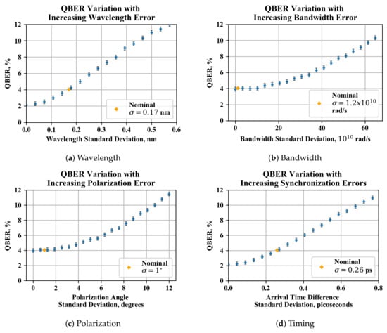 Additionally, we explore the consequences of systematically relaxing photon source tolerances to determine the sensitivity of the QBER to fluctuations in wavelength, pulse bandwidth, polarization angle, and source synchronization. The results of these simulations are shown in Figure 4. Each point in the figure represents the average QBER from 100 iterations with for a fixed set of photon source parameters. The standard deviations of (a) photon wavelength; (b) pulse bandwidth; (c) polarization angle; and (d) photon synchronization are varied relative to their nominal values, indicated by orange diamonds, while other photon source parameters are held fixed. As expected, the QBER increases with increasing probability of photon distinguishability due to source fluctuations.