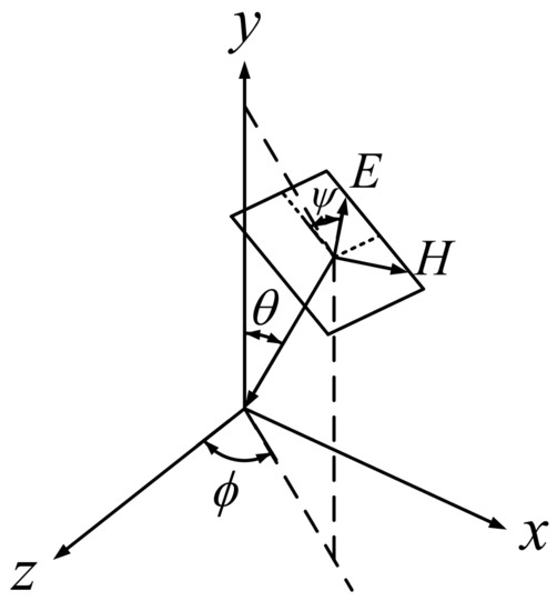 As the aperture cavities are shown on different faces, the electromagnetic waves can be coupled with the cavity through the coupling of the apertures on the different faces. The equivalent transmission line method is equivalent to the excitation source. According to the field strength at the aperture, the direction of the incident wave is arbitrary, so the field strength of different faces are different. Therefore, it is necessary to vectorize the incident wave to obtain the field strength of the different surface seams. As shown in Figure 4, according to the azimuth angle , the pitch angle , and the polarization angle of the incident plane wave, the components of the three different directions x, y, and z [15] are shown as