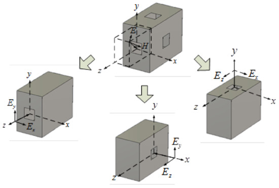 As shown in Figure 5, the incident wave can be connected to the cavity through the apertures in different faces. On the basis of the above-mentioned vector decomposition, the coupling of the incident wave to the cavity was decomposed into six problems that were analyzed separately. Where the x direction of the incident wave component can produce the y and z directions of the field strength, the y direction of the incident wave component can produce the x and z directions of the field strength, and the z direction of the incident wave component can produce the x and y directions of the field strength in the cavity.