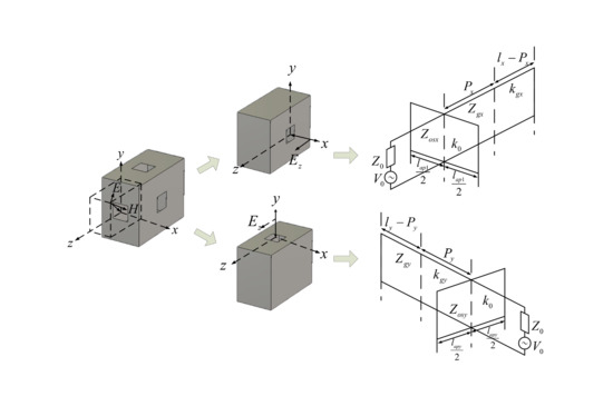 The vector analysis of the incident wave can be calculated for different incident wave components of the aperture coupling effect. This results in the following aspects of the cavity in the direction of the shielding effectiveness of a specific analysis. As shown in Figure 7, the z direction of the cavity is in the direction of the surface of the aperture and the surface of the aperture, coupling with the cavity. Because the electromagnetic waves through the surface of the aperture couples with the cavity in the z direction, and because it does not produce strong energy, it is negligible. When the incident wave is coupled with the cavity from the surface, the aperture is equivalent to the coplanar strip line with a length of and a characteristic impedance of . The cavity is equivalent to a waveguide with a length of and an impedance of , in which is mainly determined by the cavity sizes , , and the waveguide mode. After obtaining the above parameters, we can obtain the shielding effectiveness of P, which is distance from the aperture.