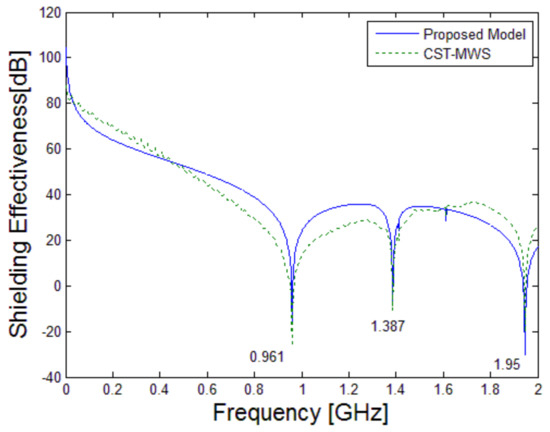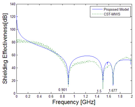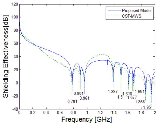Figure 9 shows the shielding effectiveness of the center of the cavity in the x direction. The solid line in the figure shows the results of the improved equivalent transmission line method, while the dotted line represents the CST simulation results. The figure shows that the results of this method and the CST simulation results are basically consistent.