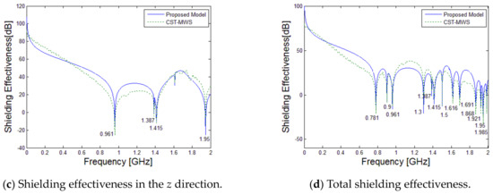 Figure 13 shows the total shielding effectiveness at the center of the cavity. It can be seen that the results obtained from the equivalent transmission line method are in good agreement with the CST simulation results. The frequency of the minimum shielding effectiveness at the center point of the cavity matches the theoretical resonant frequency in each direction shown in Table 1, Table 2 and Table 3, respectively, which proves the correctness of the improved equivalent transmission line method.