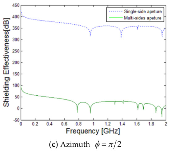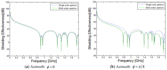 It can be seen from Figure 15 that the effects of different azimuth angles on the single sided aperture cavity and the three-sided aperture cavity are different. When the azimuth angle is equal to zero, the shielding effectivenesses of the two are basically the same. When the azimuth angle is equal to , due to the presence of the other two faces on the multi-sided cavity, the overall shielding effectiveness is weaker than that of the single side aperture cavity, which brings about an increase of the number of minimum values in the shielding effectiveness t. This is because of the other two sides of the aperture, which are of different directions of the field strength component, resulting in an increase in the cavity field strength component at the center of the cavity. When the azimuth angle is equal to , there is quite a difference in the shielding effectivenesses. The shielding effectiveness of the single-sided aperture cavity is very high, between 300 dB and 425 dB, because it has been shielded from electromagnetic interference. The shielding effectiveness of the multi-sided aperture cavity is between −50 dB and 100 dB, because the incident wave illuminates the cavity from the side under the aforementioned azimuth angle, as the multi-sided aperture cavity has an aperture under the aperture referred to above.