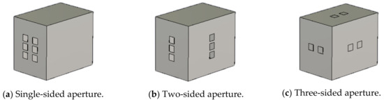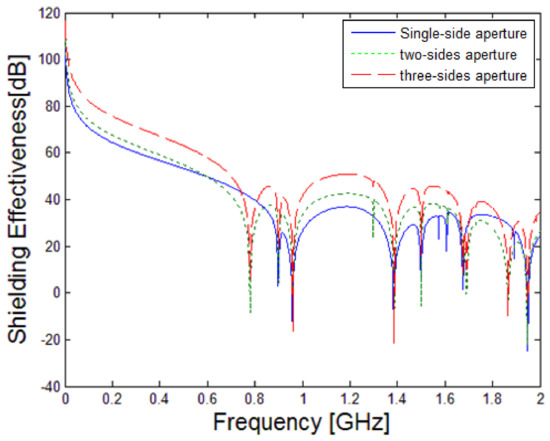 If the cavity size and the total area of the aperture array remain unchanged, the aperture of the cavity form is divided into single-sided, two-sided, and three-sided apertures (all the aperture sizes are 1.5 cm × 1.5 cm). The shielding effectiveness of the multi-sided apertures show in Figure 16 using the improved transmission line method is shown in Figure 17. If the total aperture area is kept constant, the multi-sided apertures can enhance the shielding effectiveness of the cavity, but the multi-sided apertures will produce the extra shielding effectiveness at the minimum point, thereby increasing the probability of electronic equipment interference. It can also be seen from the figure that the number of shielding effectiveness minima of the two-sided and three-sided apertures are the same, because the x direction of the incident wave component can produce a field strength in the y and z directions of the cavity that are the same as the y and z directions of the incident wave component. Therefore, only two different sides of the aperture can be generated in the cavity in three directions of field strength. It is thus possible to effectively enhance the shielding effectiveness of the cavity by sewing the aperture on different sides, which would create additional minima points of the shielding effectiveness. Therefore, different aperture forms should be selected according to the characteristics of the electronic equipment.
