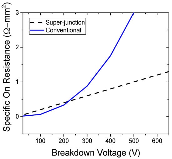 The lack of improvement in RDS(on) of the examined SJ LDMOS device reduces or negates the benefit of using SJ for the 30 V range. Equation (1) shows the on-state resistance as a function of breakdown voltage (BVDss) for both the conventional and SJ devices []: