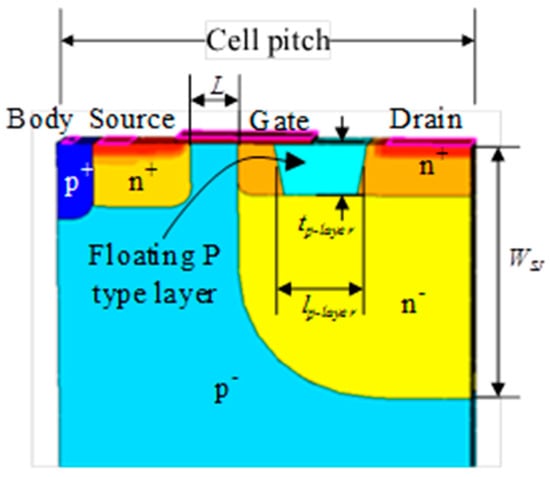 The implementation of a floating p-type layer in place of the STI gate edge region is a technique that is examined for the LDMOS device; the method is also implemented in []. The technique was investigated for low-voltage devices to measure the possibility to outperform SJ in this voltage range. Figure 4 shows a cross section of the device considered. It can be seen from Figure 5 that the device has a simpler 2D cross section when compared to that of the SJ LDMOS. Its device dimensions are given in Table 3. The device cell pitch has also been modified and reduced from 8 µm to 3 µm. This achieves a higher cell density improving the on-state characteristics of the device. Table 2 lists some of the key device dimensions.