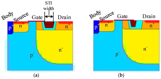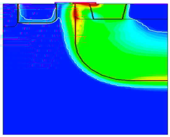 It was observed that the peak electric field of the floating P LDMOS device occurred on the surface of the p-type layer as shown in Figure 6. It is known that the critical electric field of silicon is around 5 × 105 V/cm; the electric field on the surface exceeds that of the critical electric field as the device approaches breakdown and is the major source of impact ionization in the device. To counter the effects of the surface peak electric field, it was necessary to replace the material of the affected region with a material that has a higher critical electric field. Since the affected region is on the surface of the device, it is feasible with an SiO2-filled trench realized at the same time and in the same way with the STI used in the fabrication process, as demonstrated in Figure 7.