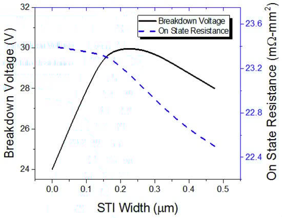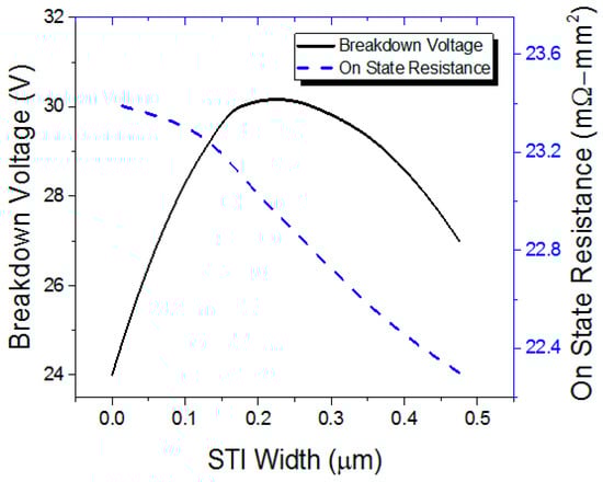 The performance of the device was optimized by adjusting the size and placement of the oxide STI region. Figure 8 plots the performance of the device when the STI is staggered by shifting it to the left. An STI width of around 0.25 µm was the optimal design point giving the desired 30 V breakdown and the RDS(on) value is equal to 22.8 mΩ-mm2. Reducing the STI width from 0.25 µm to smaller values will increase the on-resistance and decrease the off-state breakdown voltage, as shown in Figure 8. For example, when the STI width is reduced from 0.25 µm to 0.125 µm, the RDS(on) increases from 23 to 23.3 mΩ-mm2 and the breakdown voltage decreases from 30 to 29 V. On the other hand, when the STI width is increased from 0.25 µm to 0.375 µm, the RDS(on) decreases to 22.7 mΩ-mm2 but the breakdown voltage decreases 29 V. Figure 9 plots the performance when the STI is centered with respect to the mid-point of the P type layer. In this case, the optimal width for the STI centered with respect to floating P type region is around 0.28 µm. Similarly, reducing the STI width from 0.28 µm to smaller values will increase the on-resistance and decrease the breakdown voltage (see Figure 9). When the STI width is decreased from 0.28 µm to 0.125 µm, the RDS(on) increases from 22.8 to 23.3 mΩ-mm2 and the breakdown voltage drops to about 29 V. On the other hand, when the STI width is increased from 0.28 µm to 0.375 µm, the RDS(on) decreases to 22.5 mΩ-mm2 but the breakdown voltage decreases 29 V as well.
