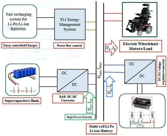 A previous study [] presented a SC/HESS/battery through a novel MIC topology for EVs; in this research, a rule-based EMS was used to charge SCs during regenerative braking and the battery power during propulsion. This method was effective, but it had two serious disadvantages: it did not limit the rate-of-charge battery power and it did not consider the state-of-charge. Based on the literature survey it is necessary to design an EMS in which the battery/SC HESS will control overcharging and SC/battery currents during the output power peak. With respect to the above issues, this paper also presents a fuzzy logic-based intelligent energy management system (FLIEMS) to determine the effect of battery/SC hybridization on the battery output power. The three main objectives of the paper are as follows: (1) a fuzzy logic-based fast charging scheme was designed for Li-ion batteries so that an electric wheelchair can move freely with less concern regarding the long wait for recharging; (2) an intelligent power management was designed for the SC-Li HES to effectively utilize the power from the SC-Li during charging, discharging, and regenerative modes, which was achieved by designing a fuzzy logic-based intelligent energy management system with a rate limiter for lithium ions. The presented EMS aimed to regulate the state of charge of super capacitor (SOCSC) using the developed FLC and the battery power peak was reduced using a rate limiter; and (3) a dual active bridge converter system was designed to facilitate the charge/discharge process during different modes of wheelchair operation. The working DAB converter designed in this paper was based on an EPES to offer easier power conversion than those conventional algorithms. The remainder of the paper is organized in three sections. Section 2 provides the theoretical background and components for the design of the proposed HES system and experimental set up for the proposed study. Section 3 discusses the results obtained from the study and reports the conclusions of the overall research.