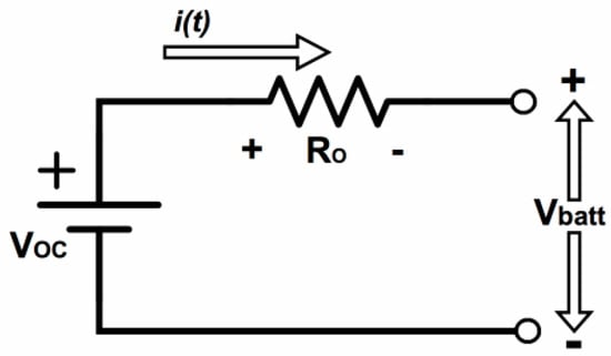 Lithium-ion batteries are commonly used in portable electronics, but are now being used in large-scale applications, such as electric vehicles and grid-connected systems. Li-ion batteries offer lower weight, volume, temperature sensitivity, and maintenance. Lithium-ion battery packs have a longer life than other types, such as lead acid, because of the higher round-trip efficiency than many options []. When choosing a battery for an EPW, it is important to consider the life and maintenance. The battery modeling approaches rely on the desired details in the model. The equivalent circuit model includes resistors connected in series with a constant voltage source, as shown in Figure 2 []. The equivalent circuit can exhibit simple, dynamic, and stable state behaviors [].