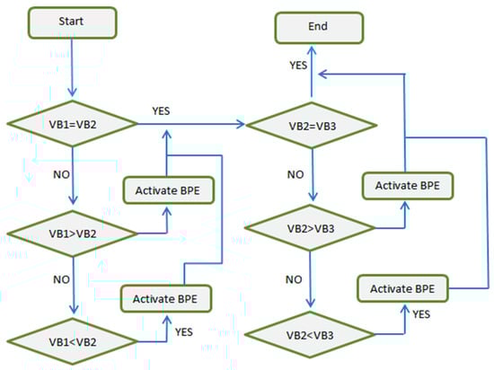 Li-ion batteries have very intricate nonlinear chemistry, and because the FLC does not need to control the precise mathematical model, an FLC adaptive method has been developed to control the battery cells. The charging time increases due to misbalancing voltages during charging time. The charging efficiency can be improved using a FLC to control the current in the CC-CV section. In this paper, we proposed a bypass equalization (BPE) technique controlled by the LC controller (see Figure 3). The BPE scheme is used for cell voltage balancing in multi-cell battery systems. Figure 3 presents the BFE algorithm for intelligent charging system arrays for the BPE method. The proposed intelligent charging system can reduce the charging time based on the fuzzy control rule ensuring that each cell of the battery string operates within a safe voltage range.