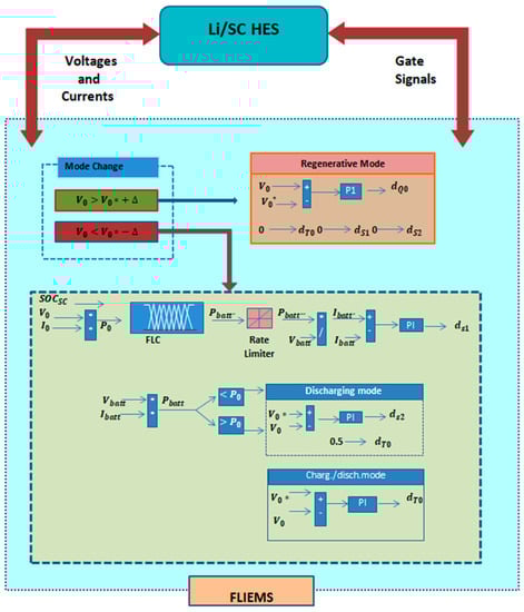 Figure 4 shows a detail working of the proposed FLIEMS. The EMS first decides the mode of operation by reading and analyzing the output voltage. The amount of power required for the motor is determined by the power available from the Li-ion battery and the SOCSC for the FLIEMS. To control the SOCSC at a reference value the battery reference power is determined by the FLC. In order to supply the desired demand, this value should be determined and the available braking energy to be captured has sufficient capacity should be ensured. To smooth the battery power profile, the rate limiter defines the slew rate of the reference battery power. Finally, the battery current is tuned utilizing a proportional integral (PID) controller to acquire the required battery power. The suggested control strategy selects the discharge mode or the charge mode by associating the battery with the output power level: the discharge mode is activated if the battery power is lower than the output power. Otherwise, the charge/discharge mode is enabled. For implementation of the FLIEMS specific attention should be given to battery chargers to control the gradual changes in the charging and assigning functions of the battery. As reported in [], increasing (the duty cycle of time) extends the input voltage range of the converter; the efficiency increases with increasing switch stress.