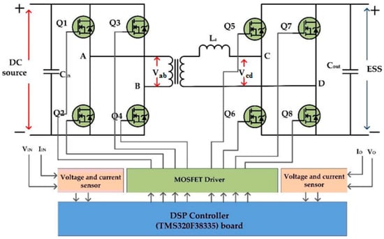 Figure 5 shows complete assembly for the DAB IBDC converter with switches, transformer, drivers, sensor, and DSP controller. The DAB DC-DC converter mainly contributes in application-related power electronics, such as semiconductor transformer electric vehicles and battery energy storage, due to its distinguishing feature of electrical isolation, high transmission efficiency, high power density, and bidirectional flow. The design of a high-frequency transformer, T, is mainly associated with bridges, such as the primary H-bridge consisting of Q1 to Q4, the H-bridge from Q5 to Q8, and the secondary bridge from Q1 to Q4. The inductor ‘L’ is the transformer primary side leakage inductance and harmonizing inductance. V1 and V2 are primary and secondary side voltages. The winding ratio of the transformer is set to 1; if not so, there can be back current flow from secondary on the primary side [,], due to which n = 1 was used during our analysis. Figure 6 illustrates the resulting curve of the DAB-IBDC using ESPS control, where d is the phase shift ratio between the primary and secondary voltages and T is the half switching period of the isolated high-frequency transformer having a value of d between ‘0′ and ‘1′ []. The square-shaped wave from Vab and Vcd were observed, and due to the inductance in the converter circuit association among the two voltages was observed. The primary voltage will not always be in phase with the primary current because it passes through the inductor. Based on the waveform IL the average current of the leakage inductor is derived. At inductor L mismatching between Vab and Vcd occurs, and at inductor current IL during switching of t1 and t2.