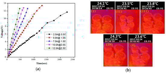 (a) Charging characteristics at different charging currents (2.5 A, 5.0 A, 7.5 A, 10.0 A, and 12.5 A); and (b) thermal images of the SC bank at different charging currents (I) 2.5 A, (II) 5.0 A, (III) 7.5 A, (IV) 10.0 A, and (V) 12.5 A.