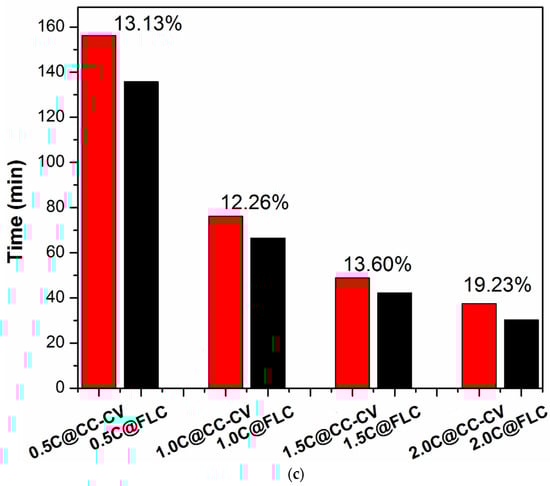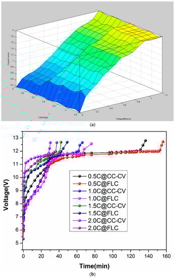 Rapid charging of the proposed FLC charging system was confirmed using the flowchart explained in Section 2.1.2.3 and recording the data from the experimental setup developed in Section 3. The fuzzy controlled bypass equalization helped reduce the charging time of the Li-ion batteries. Figure 8 compares the conventional CC-CV charging with the FLC for a three-cell arrangement. Figure 8a shows the output current based on the cell voltage and voltage difference for the defined FIS (fuzzy interface system) variables (cell voltage and output current) with membership functions (very small, small, medium, large, very large). An increase in the charging current decreases the charging time, and Figure 8b shows the charging characteristics of Li-ion batteries at 0.5 C, 1 C, 1.5 C, and 2.0 C for CC-CV and FLC chargers. Figure 8b shows the voltage of the batteries and time required to fully charge the cell at different charging currents. During the process of Li-ion charging, a fuzzy control device was used for feedback control, which is used in the FLC charger and fine-tuning, resulting in an increased output current to shorten the charging time. The performance of the FLC-based charger increased with increasing charging current, as shown in Figure 8c. The FLC controlled BPE proposed in Section 2.1.2.3 is the main reason for the reduced charging time. A net percentage decrease of 13.13%, 12.26%, 13.60%, and 19.23% occurred at 1 C, 1.5 C, and 2.0 C, respectively, with FLC charging compared to CC-VV charging (as highlighted in Figure 8c).
