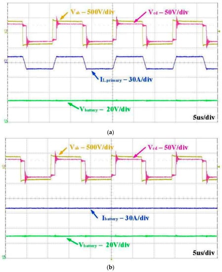An experimental module of the DAB converter was designed and analyzed at a 2.8 kW load for the proposed HESS was analyzed as shown in Figure 9. The input source on the primary side of the DAB converter is connected to the DC-bus HESS to the energy storage component (i.e., SC and Li-ion, which operate in parallel). A phase shift was introduced and the Vcd square wave was shifted from the Vab square wave, as shown in Figure 9. The switching frequency was kept high and a fixed value, i.e., fs = 70 kHz, was used. The orange line waveforms represent Vab, while dark pink, blue, and green represent Vcd, battery current, and battery voltage. The experimental module for the DAB converter captures the operating point maximum power at a phase shift d = 0.3 and a battery voltage of 28 V. The high-value switching frequency offers low phase shift values required at full load. The secondary side switches reduce the conduction losses. The DAB converter can operate both in buck and boost modes. Results for buck mode when ESS charging is in progress is shown in Figure 9a and when the ESS is fully charged is shown in Figure 9b. The experimental results show the current at 100 A when the battery voltage is limited to 2.8 kW.