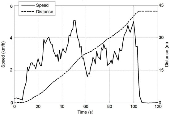 To confirm the effective use of the FLIEMS, the profile for the wheelchair speed and distance covered was designated. Figure 10 presents the distance variation and speed. The speed profile of the wheelchair increased and decreased, highlighting different needs of power during the movement of EPW at such speeds. The maximum speed acquired by EPW in Figure 10 is about 5.2 km/h while the net distance covered by the EPW is approximately 250 m.
