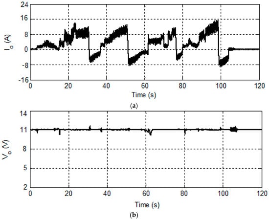 Figure 11 depicts the variations in the output voltage and current changes according to the wind and speed profile highlighted in Figure 10 using the FLIEMS. The current demand for the motor in an electric wheelchair alters the output current fluctuation with acceleration and deceleration during the different time intervals (see Figure 11a). The output voltage remains constant with almost no variation in the output voltage waveform providing proof that the voltage is regulated regardless of the variations in the output current (Figure 11b). On the other hand, the FLIEMS showed that the output voltage regulation was successful. This shows that the proposed FLIEMS can properly realize the transition occurring during the different operation modes.