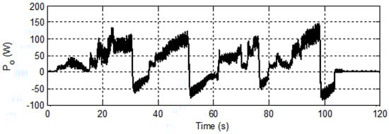 Figure 12 shows the change in the resulting output power level and the source power level. The maximum output power during the movement of an electric wheelchair and regenerative braking were approximately 150 W and 90 W, respectively.