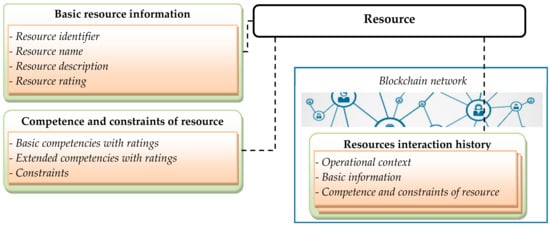 Figure 3 shows the resource profile model that is aimed at automating the process of coalition creation and takes into account the ratings of the resources considered for coalition formation. Every time the resource participated in the coalition, other resources and users have the possibility to estimate their competencies’ ratings and the overall rating of the resource. The model consists of the following components: basic resource information, its competence & constraints, and resource interaction history. Basic resource information includes the following information about the resource: identifier, name, description, and rating. Competence and constraints of resource is aimed at description of the tasks the resource can perform and constraints that have to be satisfied to perform these tasks. Competence and constraints of resource includes: basic competencies, extended competencies, and constraints. Basic competencies and extended competencies can be estimated with ratings by another resource, and users. The blockchain network is used for the following purposes. First is a coalition formation. During the coalition formation process the potential resources share their competencies and get subtasks that are parts of the task. Each subtask assignment is stored in the blockchain network. In this case for other resources it is easy to check who is responsible for a certain subtask. If some resource fails in the subtask, its competence rating is decreased, and the resource can be replaced by another one with a higher competence rating. In the case of a subtask performed successfully, the ratings of competencies related to this subtask are increasing. All rating changes are stored in the blockchain network and can be tracked for preventing the unauthorized changes. The second purpose is aimed at information exchange and consumables tracking. During the subtask performance, each resource can spend some of the system’s consumables (e.g., power, time or task-specific resource, like seeds for planting). The details of consumables spending is stored in the blockchain network. Every resource can check at any time the value of consumables that was spent by another resource for subtask performance. It is helpful to track the task performance as well as for in-time consumables supplying and increasing the efficiency of joint work by adjusting the coalition. In these cases the blockchain network is used to prevent the submitting and use of malicious information. Only signed information from coalition members can be used in joint task performance. The immutability property of the blockchain allows us to track actions performed by each resource and detect the guilty resource that causes the failure and decrease its competence rate. Unlike existing approaches, the blockchain can provide an immutable log with distributed trustiness between robots without any central point. In cases when robots are acting only with each other, without any central node, the blockchain can simplify trustiness providing.