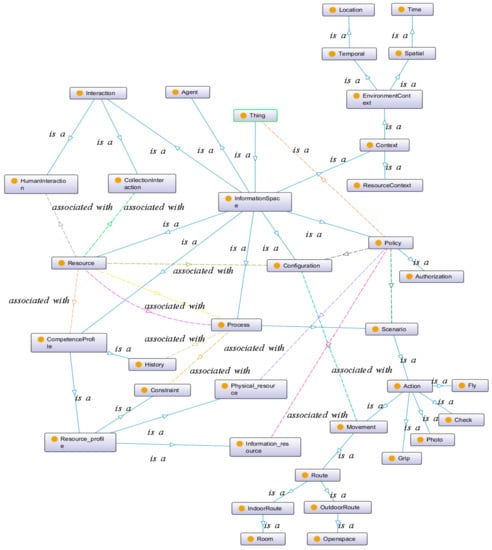 The approaches described by [,] require a well-defined functionality of robots, so the set of tasks undertaken is restricted. The paper [] describes the knowledge of the capabilities of robots that is generated dynamically during the execution of tasks what allows to manage the robots effectively. Thus, no limitation to robots’ functionality and dynamic determination of the options available can provide the widest range of tasks to execute. Authors of the paper [] show the effectiveness of the indirect interaction of robots, that is, the interaction through an intermediary that is Smart-M3 platform in the paper. The paper [] discusses a formal model that can be used for interaction. In the paper [] the effectiveness of using specialized language for robots control is shown. Authors of the paper [] demonstrate the applicability of the multi-agent systems approach for robot and human interactions in various fields. Many researches inherit the idea of ontologies usage for modelling context in social-cyber physical systems. An ontology should include description of physical components, agents, model of problem area. It consists of classes, subclasses, properties, and relationships between classes.