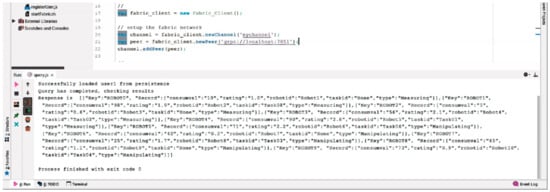 The blockchain network for the case study has been implemented based on the Hyperledger Fabric platform that is provided by community of software and hardware companies leading by IBM []. The platform provides possibilities of wide range configurations: changing of a core database for transactions and block storing, changing of consensus mechanisms, and changing signature algorithms for peers’ interaction with the blockchain. For the case study presented in this paper, the default configuration has been used that includes Byzantine Fault Tolerate consensus mechanism based on BFT-SMaRT core [], Apache CouchDB as a database and an internal solution for peer certification. This configuration provides the ability to process more than 3500 transactions per second with latency of a hundred ms. Also, the platform provides the possibility to create smart-contracts called chaincodes (program code that describes interaction between resources) using Go or Java programming languages. The chaincodes are running in isolated containers of core peers of Hyperledger based on the Docker technology stack. Figure 11 shows a system log snapshot from the blockchain during the task performance process.