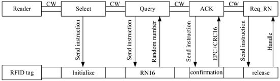 The RFID system generally consists of an RFID tag and an RFID reader. Figure 1 shows the basic communication flow based on the electronic product code (EPC) generation2 (G2) protocol [36]. Within the communication distance, the reader first sends the Select instruction by carrier wave (CW) to the tag to change the tag’s status. The reader then sends the Query instruction to the tag and the tag responds with its RN16. After that, the reader sends the ACK instruction to obtain the ID information and CRC code of the tag. Finally, Req_RN is sent by reader to acquire the Handle response of the tag.
