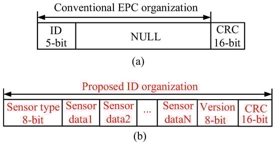 From the information discussed above, we found that there is no direct instruction for processing sensor information; hence, we have to adjust this communication flow. In general, the sensor data are stored in the non-volatile memory of the tag chip, but it exhibits long response time and high power consumption during the read/write process [20]. Thus, in this paper the sensor data is embedded into the identification (ID) information of the RFID tag. In this way, the time for reading and writing the sensor data into the non-volatile memory can be avoided, resulting in lower power consumption and response time compared with the traditional method. Figure 2 shows the comparison of the ID information between the traditional method and the proposed method.