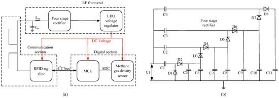 The block diagram of the proposed wireless sensor is illustrated in Figure 3a. It consists of three parts: a communication section, an RF front-end section, and a digital section. The communication section contains the antenna and RFID tag chip, which are employed to perform the transmission and reception of wireless signals, modulation, and demodulation. The RF front-end section, composed of a matching network, a four-stage rectifier, and a low dropout (LDO) voltage regulator, is adopted to provide the stable supply voltage for other parts. The matching network, containing an RF inductor (Lm) and an adjustable ceramic trimmer capacitor (Cm), is employed to realize the maximum energy transferring efficiency. The power harvested by the antenna is an ultra-high frequency signal, which cannot be used to power the remaining part of the RFID sensor directly. Therefore, as shown in Figure 3b, a four-stage rectifier is introduced to rectify and boost the harvested power to the required direct current (DC) voltage. The LDO voltage regulator is then used to generate a stable DC voltage for other parts. The digital section, consisting of a micro-controller unit (MCU) and a methane gas density sensor, is employed to achieve sensor data and control the overall operation of the wireless sensor based on EPC G2 protocol.
