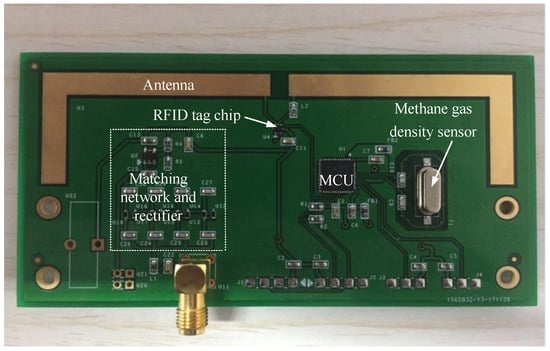 Figure 4 shows the prototype of the exploited RFID sensor tag. Aiming at the low-cost application, a dipole antenna is adopted for both communicating and energy harvesting. The antenna is etched on the FR4 substrate, the dielectric constant and thickness of which are 4.5 and 1.5 mm, respectively. The RFID chip chosen is Monza X-8K, with an impedance at 915 MHz of 19–172 Ω. The rectifier adopts a zero-bias Schottky diode SMS7630 as the switch diode for high rectifying efficiency. The NCP583 is selected as the LDO voltage regulator, which can generate 1.8 V output voltage within the input range from 1.65 to 1.83 V. The MCU adopts MSP430FR6964, which can provide 2526 kB FRAM and a 12-bit 200-ksps Analog-to-Digital Converter (ADC). This MCU only consumes 118 μA/MHz at 1.8 V supply voltage in the measurement mode. The employed methane gas density sensor is MQ-4, which can detect the methane gas density within the range of 300–10,000 ppm.