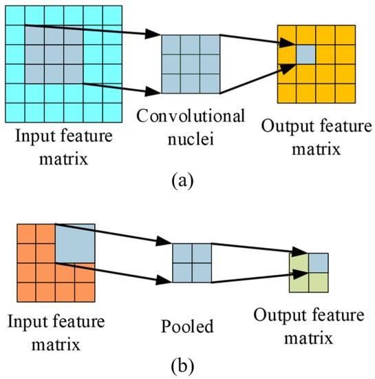 Schematic diagram of the convolution and pooling process: (a) convolutional process schematic; (b) pooling process schematic.