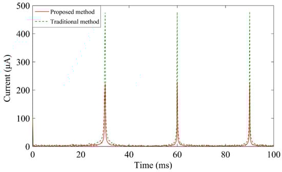 Since the supply voltage to the sensor tag is fixed at 1.8 V, the whole power consumption of the RFID sensor tag is determined by the consumed current. The proposed sensor is powered by a DC power supply PMX-35A (Kikusui, Yokohama, Japan), and the consumed current is measured by a digital multimeter Keithley 2010 (Tektronix, Shanghai, China). The developed sensor tag is activated every 30 ms by an RFID reader. Figure 8 illustrates the current waves of the RFID sensor, employing these two different sensor data storage methods. The measured currents of the proposed method and the traditional method are 207 μA and 478 μA, respectively. The proposed sensor tag still has a current consumption of 4.2 μA in sleep mode.