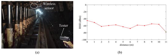 where YR is the RSSI (dBm) and X is the received signal power (mW). As shown in Figure 9a, the RSSI performance of the proposed wireless sensor was performed in the underground mine. The experiment results are illustrated in Figure 9b. It can be seen that within the distance of 10.3 m, the RSSI is higher than −60 dBm. We know from Reference [41] that this result is acceptable.