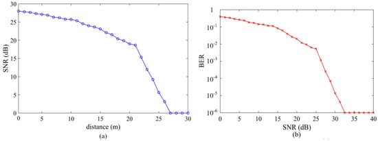 (a) Measured signal to noise ratio (SNR) under different distances; (b) measured bit error rate (BER) under different SNRs.