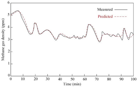 In order to verify the estimated performances of the proposed method, we tested the wireless sensor at the underground mine site. Meanwhile, a commercial gas concentration detector was put in the same spot as a reference. The proposed approach was employed to predict the methane gas density, and the measurement results are shown in Figure 11. As can be seen, the predicted results are consistent with the measured results and the maximum error is 0.42 ppm within 100 min.
