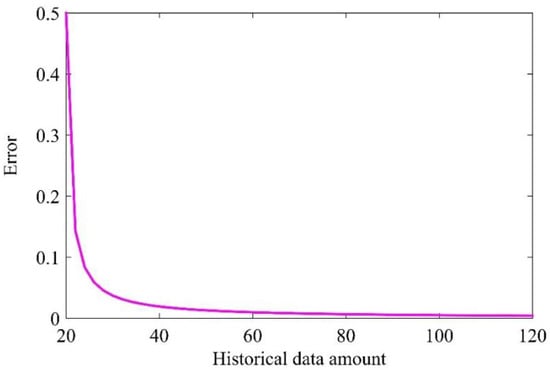 In general, the available historical data is also one of the factors that affect the prediction accuracy. Therefore, we measured the prediction error under different available historical data and the measured results are shown in Figure 12. At the beginning of prediction, the LS-SVR model is trained by little historical data, which leads to big prediction error. With the increase of available historical data, the error is quickly decreased to 0.00012. Thus, it can be deduced that the proposed method can achieve high prediction accuracy with sufficient historical data.