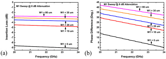 Figure 2a depicts the traditional π-attenuator, and parts (b) and (c) of the figure represent the reference and attenuation states comprising equivalent series and shunt resistances. As the width of M1 in Figure 2a scales up, the ON-resistance decreases as suggested by Equation (1). Likewise, transistor sizing additionally affects the performance of the attenuator. Consider the simulation results shown in Figure 3 for an 8-dB attenuator of the conventional structure: As the gate width of M1 increases, the insertion phase increases, while insertion loss decreases, making it impossible to optimize both simultaneously.