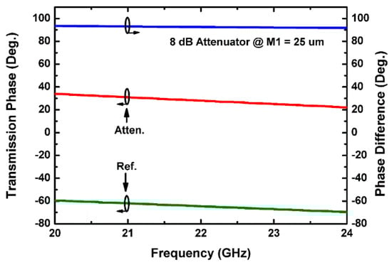 It is important to satisfy Equation (2) in order to minimize the phase difference between the attenuator’s two states, where is the transmission phase at reference state and is the transmission phase at attenuation state [17].