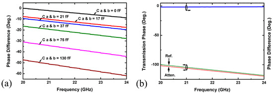 Proposed 8 dB π-type attenuator simulation results: (a) proposed structure phase difference under different values of Ca and Cb; (b) phase difference and transmission phase.