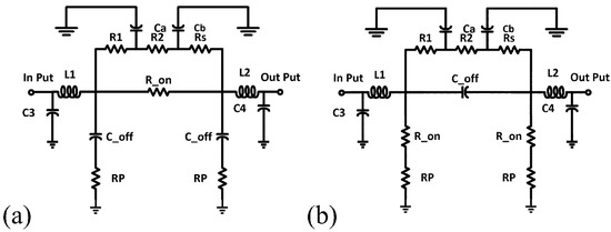 The conventional design of the switched π-type attenuators consists of switches and resistors, connected in series and parallel. The nMOS transistor, as one of the key components of a digital step attenuator, can be typically used as a switch. It contributes series on resistance when it is turned on and series off-capacitance when it is off, while passing the incoming signal from input to output. When the switch is ON, as shown by the equivalent circuit model in Figure 1a, it works like a resistor, and its R on can be estimated using Equation (1) [15,16]. The off-capacitance of the switch is also demonstrated using its equivalent circuit model in Figure 1b.