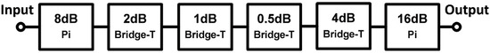 The proposed model of a 6-bit digital step attenuator is an extended version of our previously designed 4-bit digital step attenuator, simulated in the range of 31–33 GHz [18]. In contrast, the 6-bit attenuator is designed for systems that require higher attenuation, i.e., 31.5 dB with a minimum phase error, and is simulated in the range of 20–24 GHz, consisting of 64 attenuation states and cascaded in the sequence of 8, 2, 1, 0.5, 4 and 16 dB, as shown in Figure 8. Note that for larger attenuations, we have adopted Pi configuration, whereas Bridged-T configuration is chosen for smaller ones, as depicted in Figure 9. Conversely, the 4-bit attenuator merely exploits the bridge-T type attenuator [18]. Furthermore, the 6-bit attenuator which is an extension of our previous work is to implement a higher bit mm-Wave digital step attenuator on silicon-based technology.