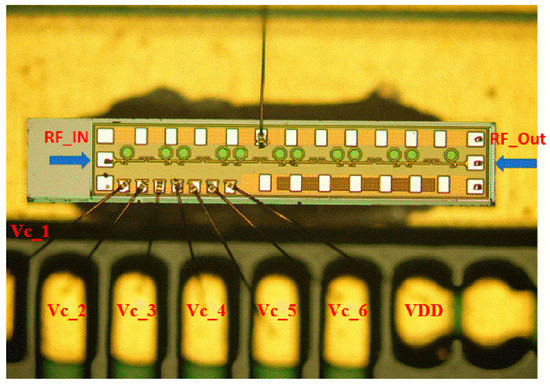 Figure 10 depicts a micro photograph of the proposed 6-bit digital step attenuator, including matching network between every two blocks. The prototypes input and output ports are indicated as RF_IN and RF_OUT respectively. The controlling terminal of each attenuator bit is denoted as VC1-6. The attenuator was fabricated using 0.13 μm SiGe BiCMOS process, and the total chip size including pad was 1.92 × 0.4 mm2. The simulation of the circuit was carried out using a tool, Cadence Virtuoso, while Peak View EM tool (Lorentz Solution, Santa Clara, CA, USA) was used for the EM simulations of the interconnects and major RF lines. The testing of a chip was executed, using Cascade Microtech’s GSG probe (Beaverton, OR, USA) and Agilent’s network analyzer (Santa Rosa, CA, USA). A DC voltage of 1.2 V was used for the gate control.