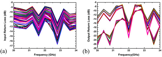Figure 11 depicts the insertion loss against the applied frequency of the proposed 6-bit digital step attenuator, which was 20.9–21.95 dB in the range of 20–24 GHz. The measured return losses for both input and output of all the attenuation states were terminated with 50 Ω load impedance, as shown in Figure 12. The input return losses were lower than −9 dB, while the output return losses were less than −7 dB for the 20–24 GHz range.