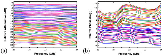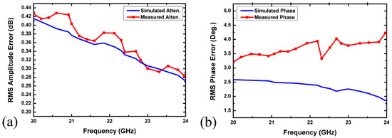 Figure 13a,b demonstrates the normalized attenuation and phase plots, relative to their respective reference states, attaining a maximum attenuation of 31.5 ± 0.5 dB in the targeted frequency range of 20–24 GHz. The measured RMS amplitude and phase errors were then plotted against the simulation results in Figure 14 for comparison purposes. The measured root mean square (RMS) amplitude error deviation was less than 0.43 dB over 20–24 GHz, which is in close agreement with the simulated results. However, the measured RMS phase error was a little more off from the simulation results and shows about a 1–5-degree difference between simulation and measured results. This may be due to the following possible reasons.