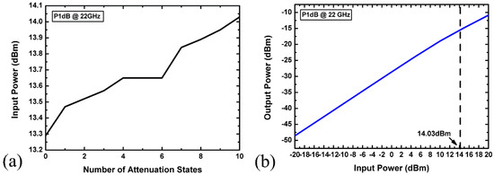 Input P1dB (a) simulation result at different attenuation states; (b) of the proposed attenuator at 22 GHz.
