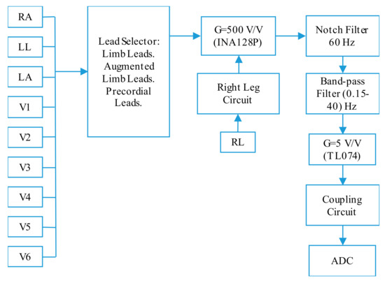 The general diagram of the circuit for the acquisition of the ECG signal is shown in Figure 2. The ECG circuit has the 12 conventional leads: limb, augmented limb, and precordial. This leads were acquired using 10 electrodes: RA (Right Arm), LL (Left Leg), LA (Left Arm), RL (Right Leg), and V1–V6. The RL electrode was used to obtain the reference signal using the driven right leg circuit. Table 1 shows the leads and the equation that was used to obtain them.