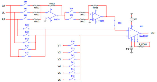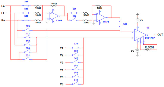 Figure 3 shows the circuit designed for the acquisition of limb, augmented limb, and precordial leads. The INA128P was used as a differential amplifier, while the TL074 operational amplifiers were used in the inverting summing amplifier configuration. The activation of the switches allows one to obtain each one of the leads according to the equations presented in Table 1.